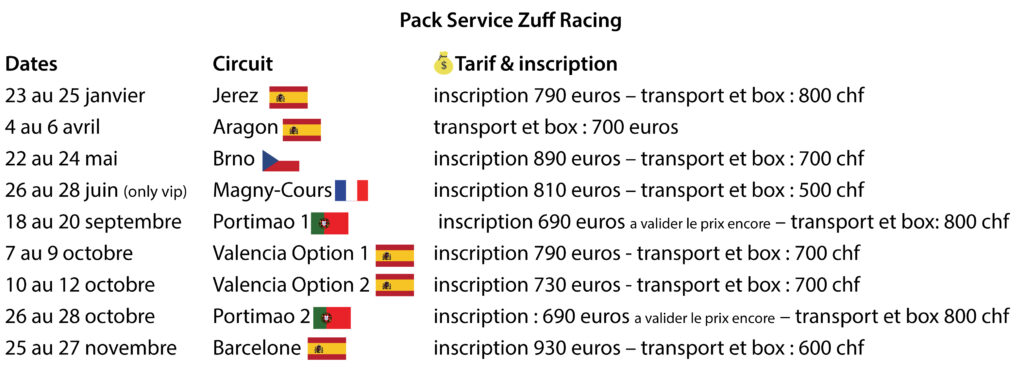 - Il n’est pas possible de réserver uniquement l’inscription sans le pack Zuff Racing.